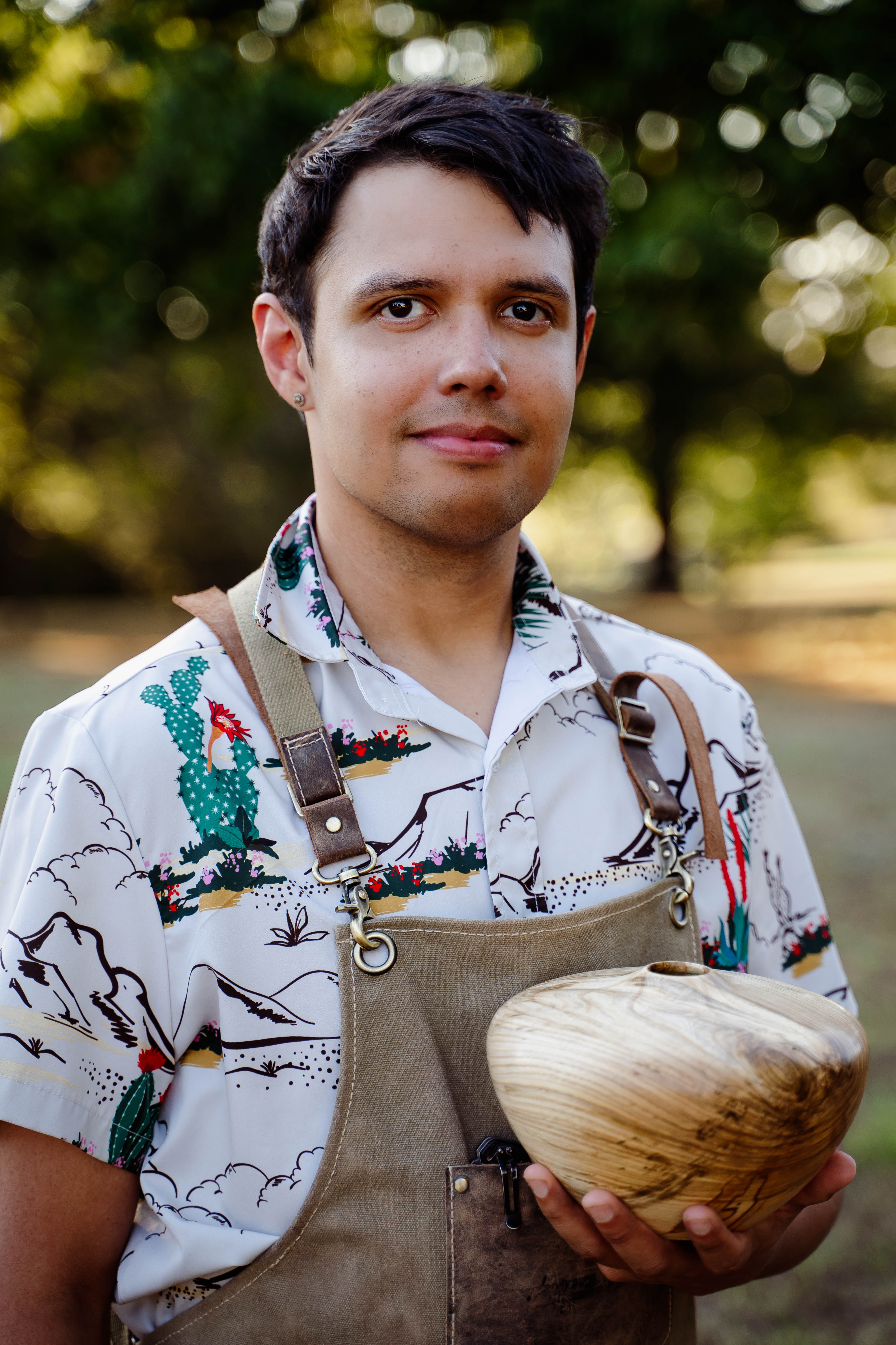 Micah Hart is a Chickasaw and Cheyenne artist based in Oklahoma City. Hart has spent his entire life surrounded by art. His mother, Jeannie Barbour, is an accomplished painter and illustrator. His motivation to take up woodturning in December 2024 is credited to spending his childhood watching his father, an experienced woodturner.