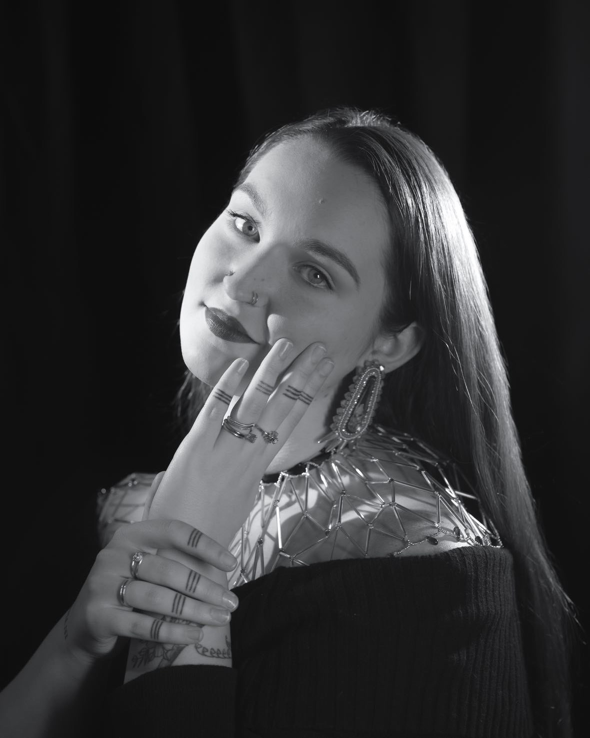 Natalie Charqueno is a self-taught Chickasaw artist from Ada, Oklahoma. She enjoys the ever-evolving relationship with her art as her style and ideas continue to grow. Charqueno desires to create beautiful wearable pieces of art that bring joy, confidence and pride to those who wear them.