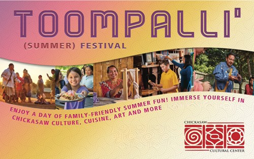 Join us for the Toompalli' Festival! This event welcomes the season of summer through Chickasaw history, culture, language, art, food and films for the whole family. This event also includes the Summer Performance Series and Inki' Day Celebration, which honors our fathers, grandfather and great-grandfathers for their contribution to our families and communities.
